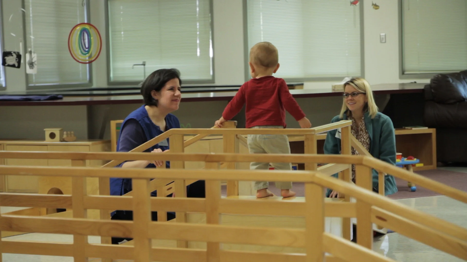Comfort: Physical comfort is important for the parents' full and genuine participation in the class. When parents are comfortable sitting on the floor, they can interact with their babies at that level. When a mother nurses, she needs a private and comfortable place to sit. When she changes her baby, she needs all the supplies that allows this to happen without incident or distraction.